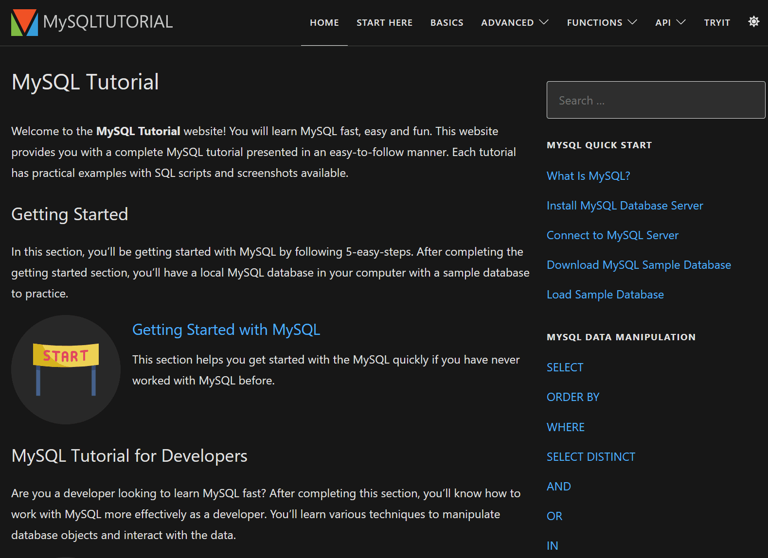 MySQLTutorial.org MySQLTutorial.org是一个专注于MySQL数据库的网站。该网站会定期发布有用的MySQL教程,帮助Web开发人员和数据库管理员更快、更有效地学习MySQL。 所有教程都很实用,易于遵循,并提供SQL脚本和屏幕截图。